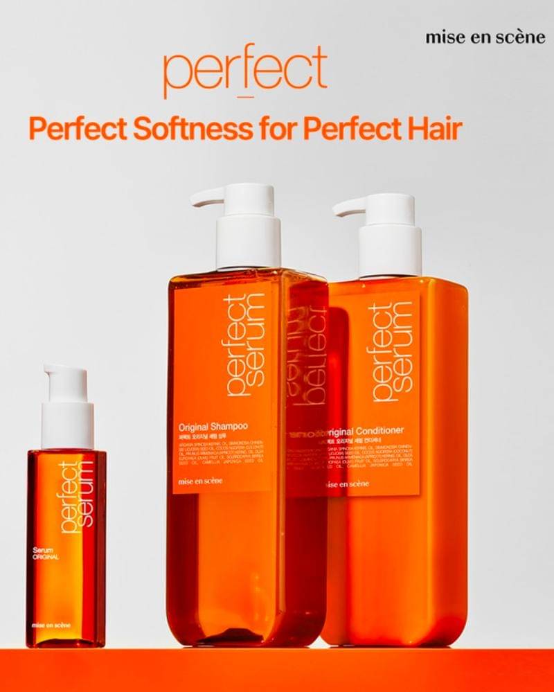 Sampo Mise En Scene Perfect Original Serum diperuntukkan bagi mereka yang rambutnya rusak karena seringnya terkena panas dan pewarnaan. Sampo ini memulihkan, memperbaiki, dan melembapkan rambut dari kulit kepala hingga ujung rambut, dengan 7 macam minyak yang kaya akan nutrisit, seperti minyak Argan, Camellia, dan Apricot.