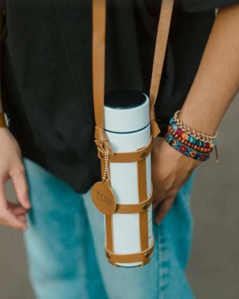 Selanjutnya, ada tas tumbler dengan bahan dasar dari kulit. Bentuknya unik dan bisa disesuaikan dengan berbagai jenis tumbler. Tali yang panjang bisa diatur panjang pendeknya.