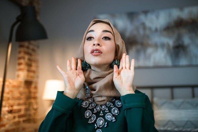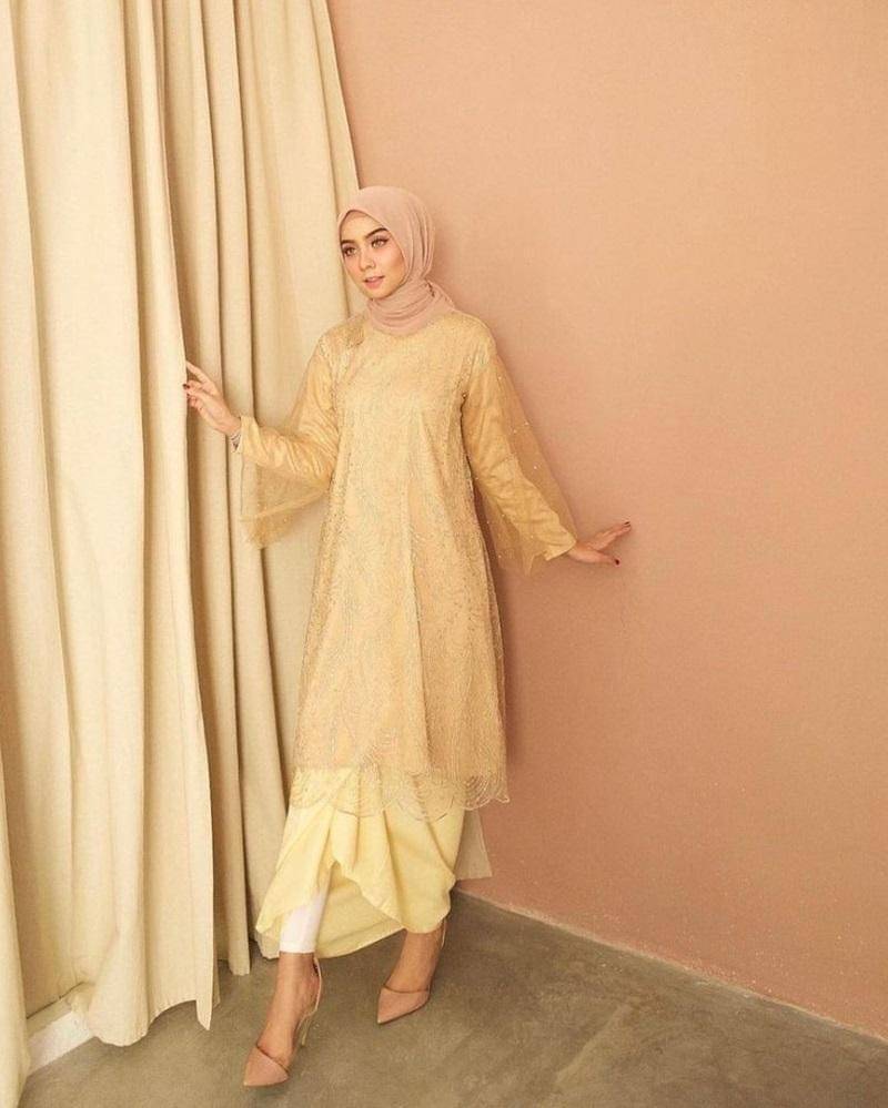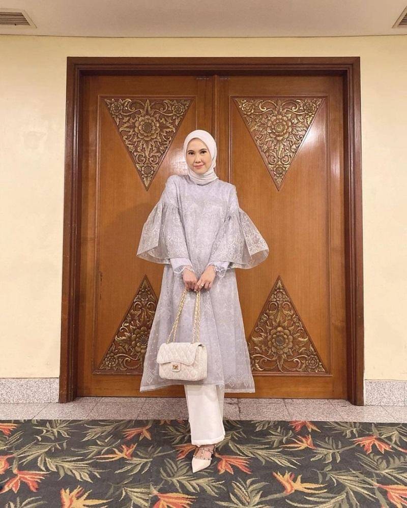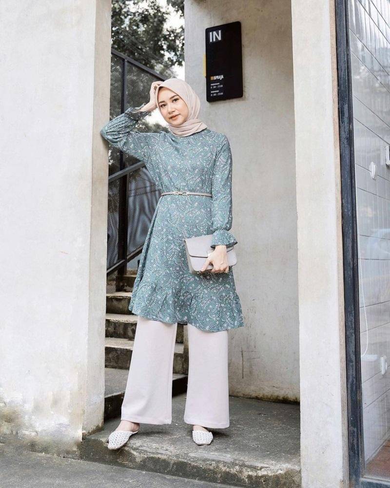 Yang terakhir adalah tunik brokat yang dipadukan dengan hijab ikat leher serta celana kulot. Yang membuatnya terlihat berbeda adalah detail ikat pinggang kecil. Terlihat manis dan feminin!