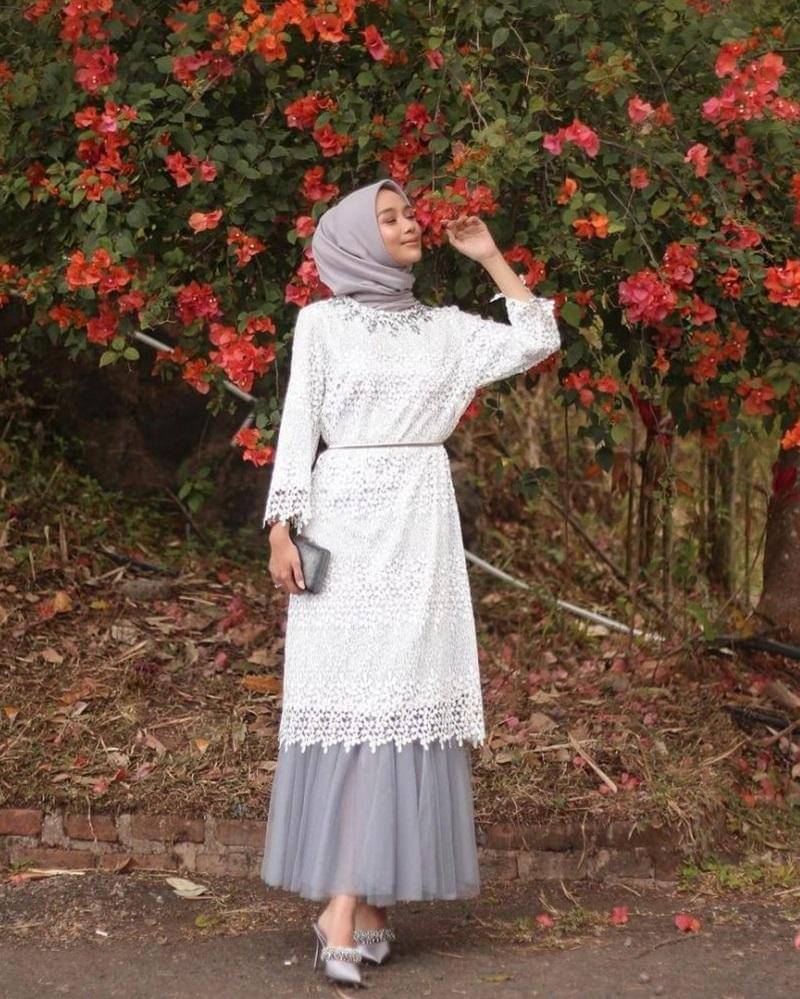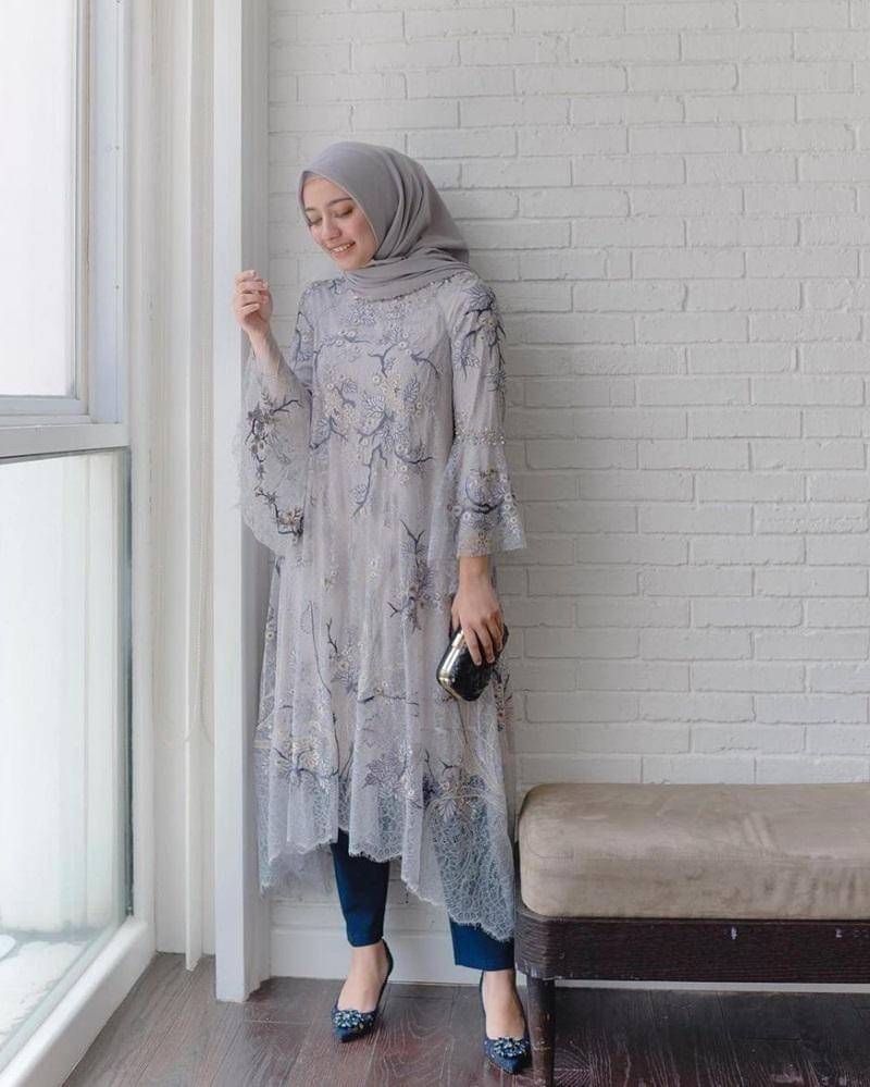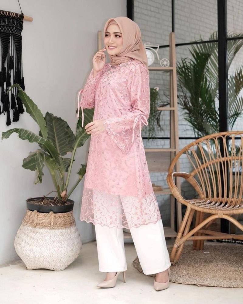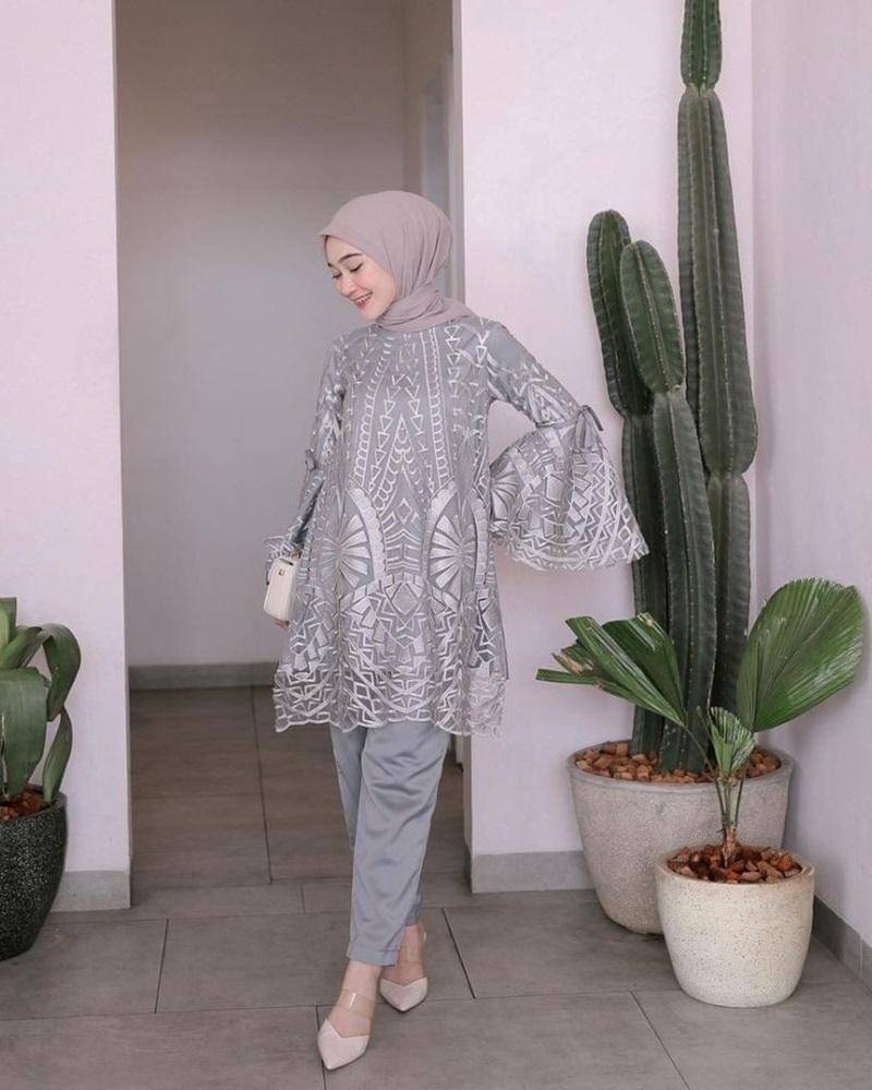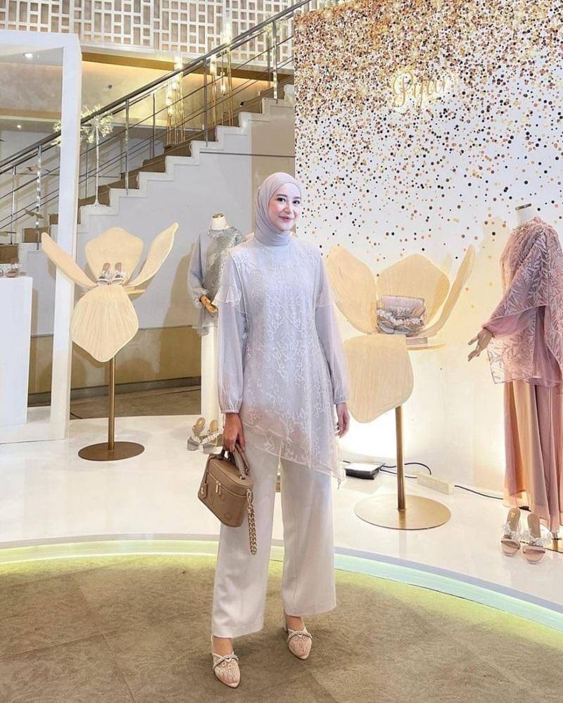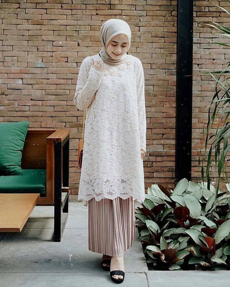 Ingin tampil satset namun tetap elegan? Maka tunik brokat dengan bawahan jadi solusi. Untuk penampilan yang lebih elegan, maka bisa pilih celana yang berwarna putih.