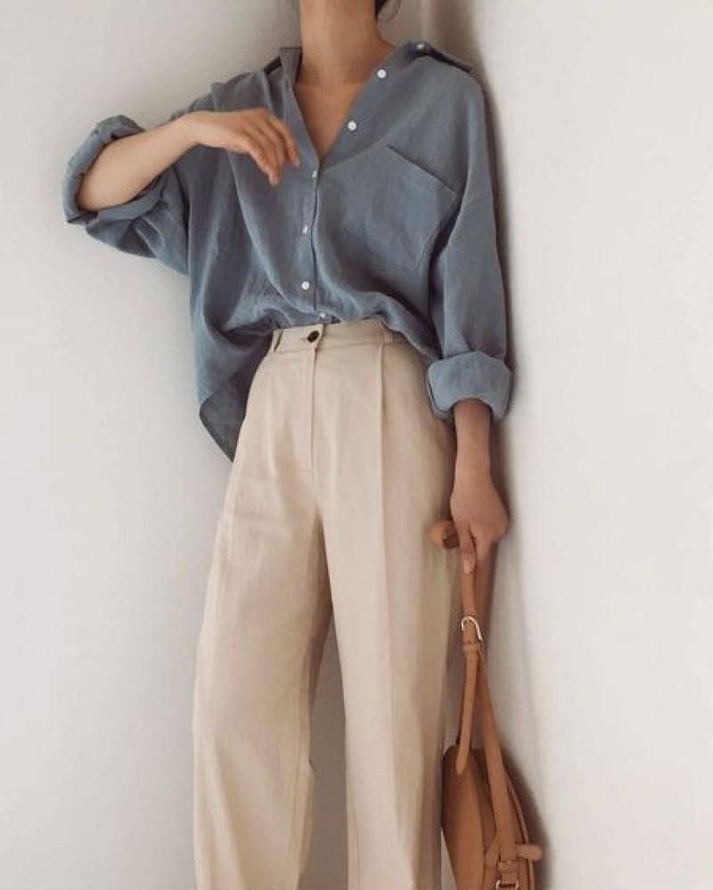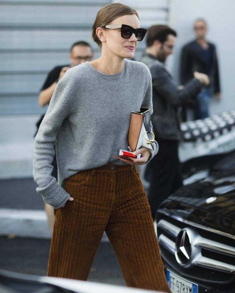 Sweater abu yang santai dipadukan dengan celana high waist berwarna cokelat. Stylish!