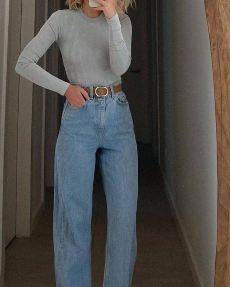 Ingin tampil santai? Pilih celana jeans untuk atasan baju abu-abu. Mama bisa memilih jeans yang high waist, mom jeans, atau ripped jeans, tergantung dengan jenis look yang diinginkan.