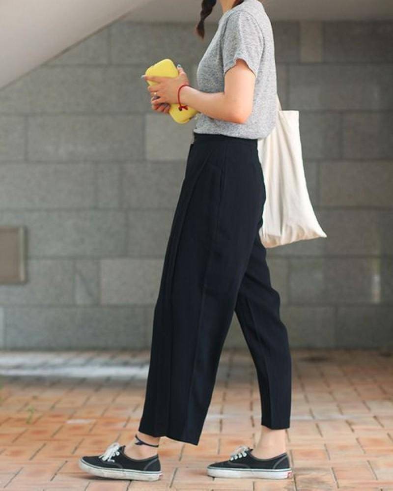 Pilih atasan kaus berwarna abu-abu terang dan celana kulot berwarna hitam. Stylish!