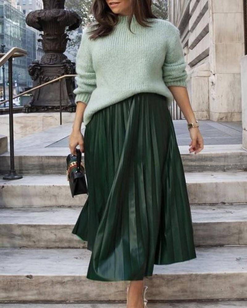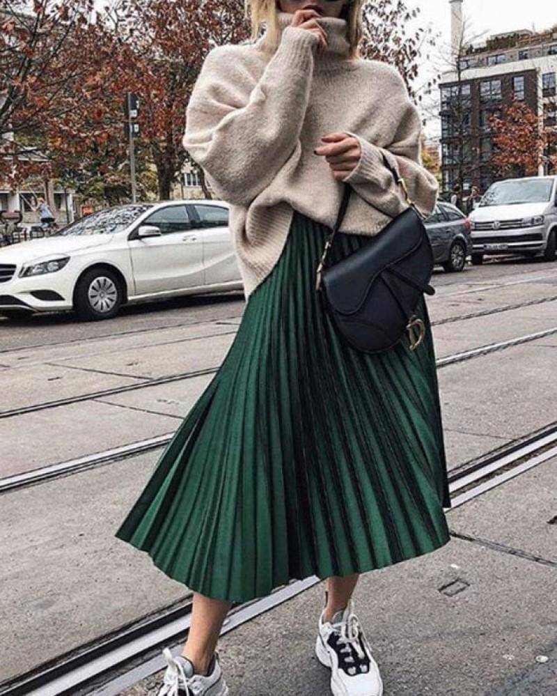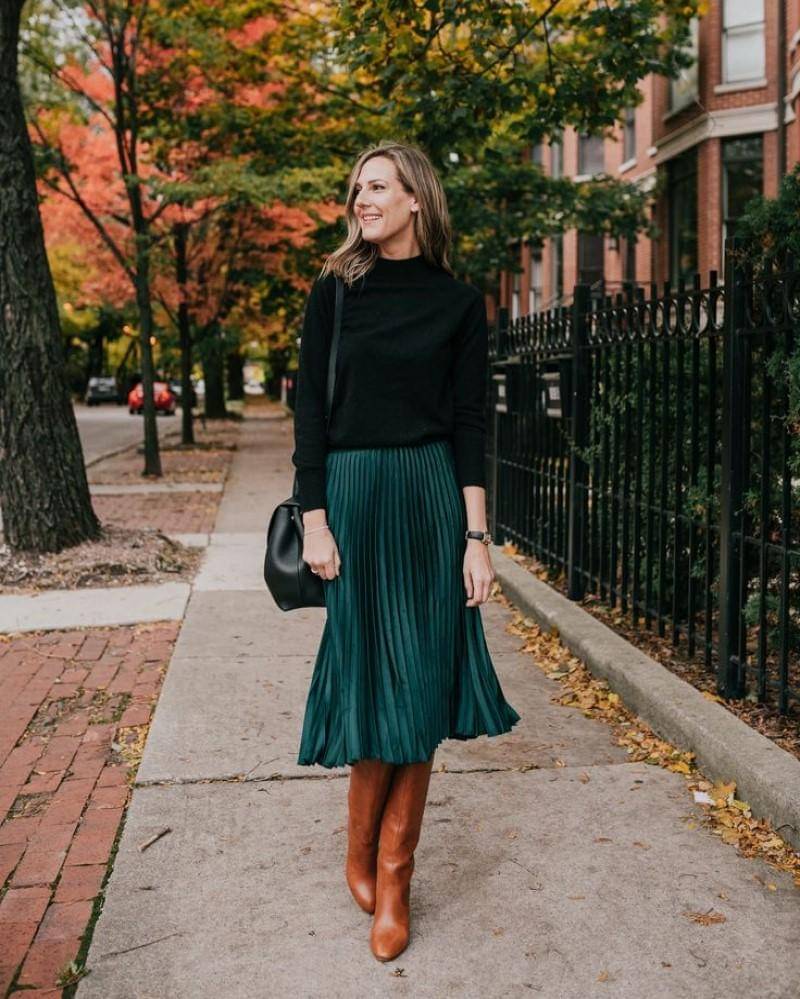 Rok hijau zamrud akan sangat cocok jika dipadukan dengan atasan hitam. Apalagi kalau roknya berbahan pleated dan atasannya adalah fit body sweater.