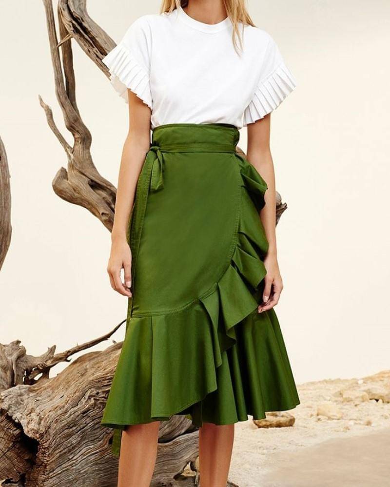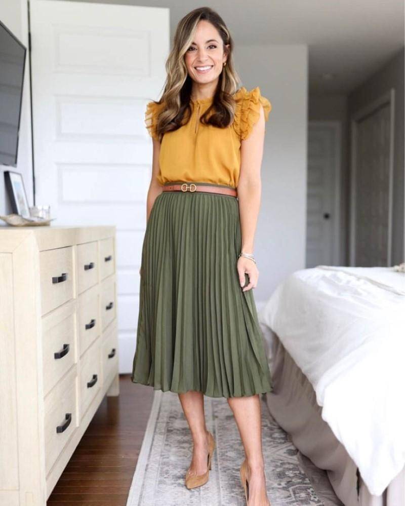 Sedang ingin menjadi show stealer hari ini? Pilih atasan kuning untuk bawahan rok hijau. Mama bisa terlihat lebih bersinar seperti bunga matahari. Rok hijau dengan bahan pleated akan sangat cocok dipadukan dengan blouse beraksen ruffle seperti ini.
