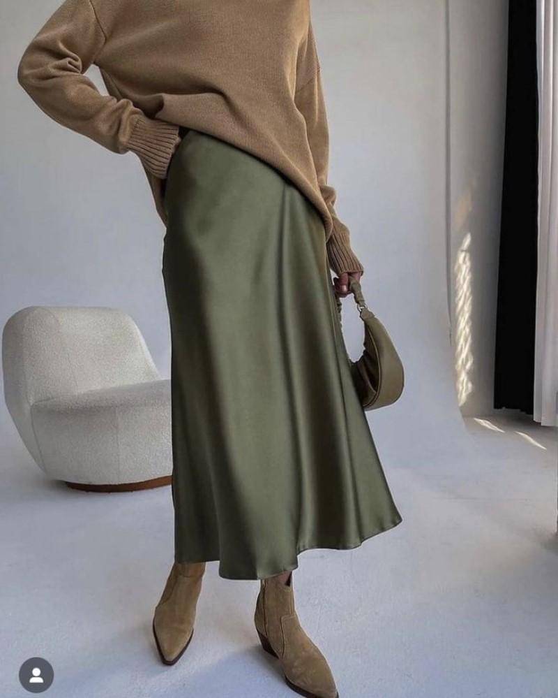 Hijau dan cokelat sama-sama warna natural yang cocok dipadukan bersama. Pilih bawahan rok silk untuk kesan yang lebih mewah. Sedangkan atasannya, Mama bisa mengenakan yang oversized untuk kesan yang lebih stylish.