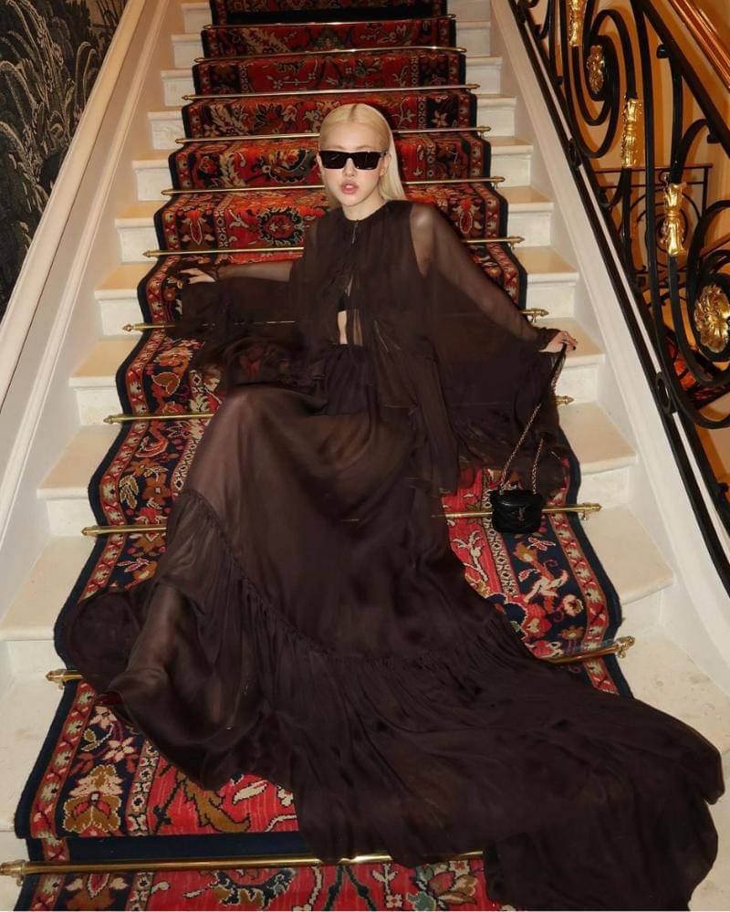 Sementara, rok panjangnya memiliki kerutan di bagian ujung, menciptakan efek berlapis dan bervolume yang menonjolkan kereta panjang yang mengalir. Seluruh look Rose kali ini berasal dari otak kreatif, Anthony Vaccarello