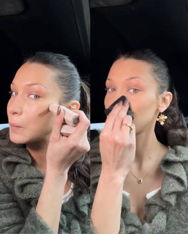 Selanjutnya, Hadid menunjukkan produk konturnya. Ia memberikan pujian untuk Fenty Beauty Matchstix Contour Stick milik Rihanna, lalu lanjut mengaplikasikan kontur tersebut ke tulang pipi, dahi, dan garis rahangnya.