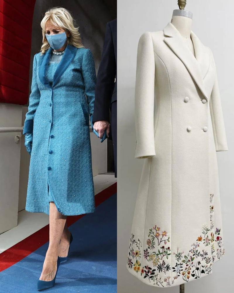 Kemudian pada Hari Pelantikan itu, Dr. Jill Biden mengenakan mantel dan gaun yang dirancang oleh Gabriela Hearst. Kedua potong tersebut berwarna putih, menampilkan sulaman yang mewakili bunga federal setiap negara bagian dan teritori di Amerika Serikat.