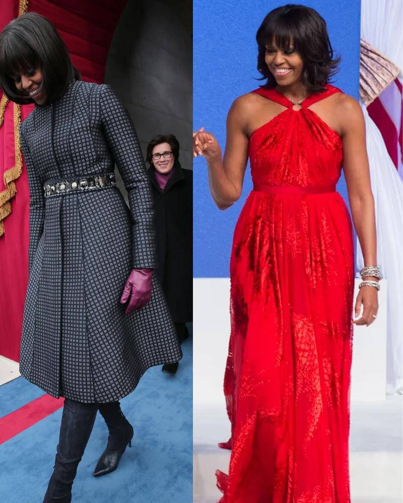 Pada tahun 2013, Michelle Obama mengenakan gaya busana kontemporer dalam balutan coat dan gaun rancangan Thom Browne yang terbuat dari sutra biru tua dengan motif kotak-kotak. Pakaian tersebut dilengkapi dengan ikat pinggang senada yang dihiasi payet metalik.