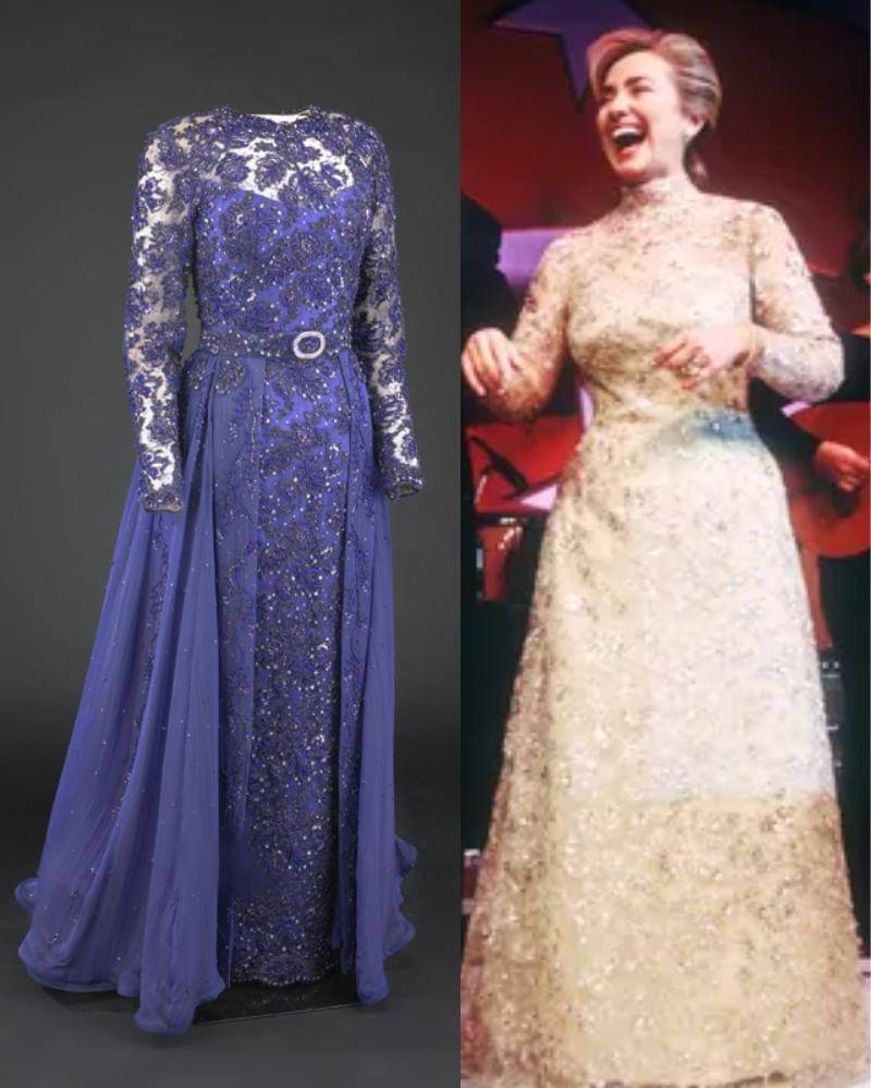 Pada pesta pelantikan tahun 1993, Hillary Clinton memilih pakaian dari desainer asal Arkansas, sebagai bentuk penghormatan kepada negara bagian asal suaminya. Gaun yang dibuat oleh Sarah Phillips itu menampilkan gaun berenda bermanik-manik ungu yang anggun, dipadukan dengan rok luar yang bervolume yang terbuat dari sutra mousseline beludru biru yang berkilauan.