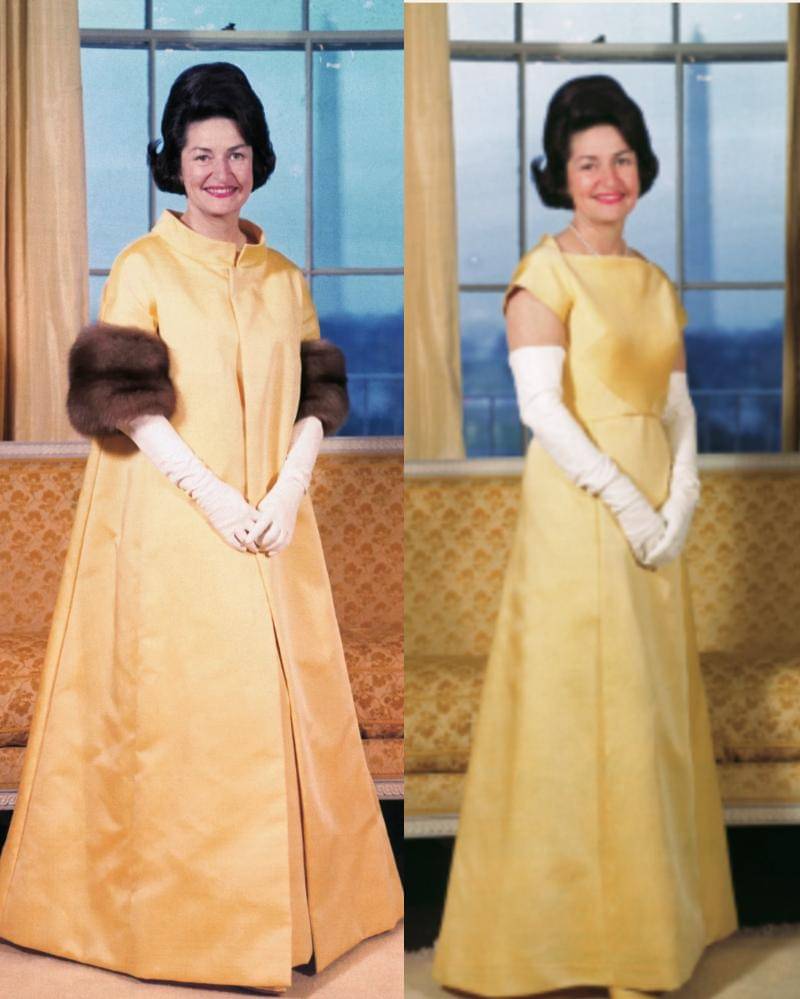 Pada pesta pelantikan, Claudia tampil memukau dengan mantel sutra-satin kuning yang mewah di atas gaun berlipit yang anggun. Lady Bird, yang selalu praktis, memilih pakaian yang tak lekang oleh waktu. Khususnya, ia menjadi Ibu Negara pertama yang memegang Alkitab selama sumpah jabatan, yang menandakan perannya sendiri dalam kepresidenan.