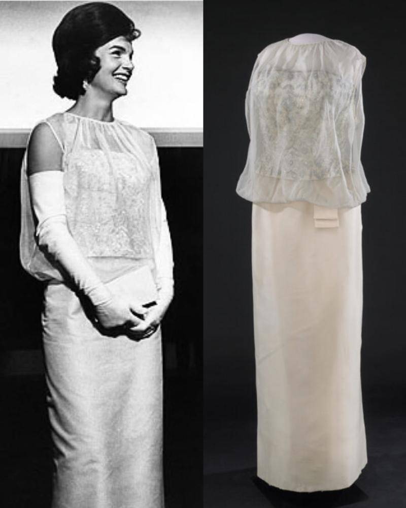 Untuk perayaan pelantikan suaminya, Jackie berperan aktif dalam mendesain gaunnya. Ia membagikan sketsanya bersama Ethel Frankau dari Bergdorf Custom Salon. Hasilnya adalah gaun sifon sutra tanpa lengan berwarna putih pucat yang ramping, dihiasi dengan lapisan sifon yang disulam dengan benang perak.