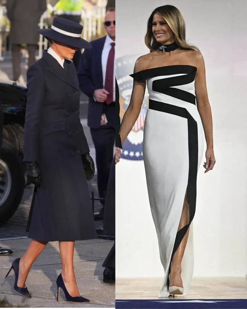 Untuk upacara pelantikannya yang kedua, yang diadakan di dalam ruangan karena cuaca, Melania Trump memilih pakaian yang ramping dan berpotongan khusus yang menampilkan coat dan rok double-breasted biru tua rancangan Adam Lippes, dilengkapi dengan topi bergaya pelaut dengan pita putih dari Eric Javits.