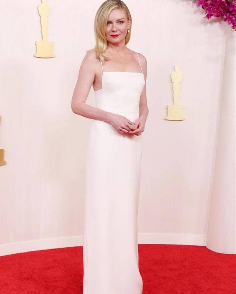 Selanjutnya ada Kirsten yang juga mengenakan gaun putih. Bukan peplum seperti Emma Stone, melainkan long dress dengan strap spaghetti yang seksi.