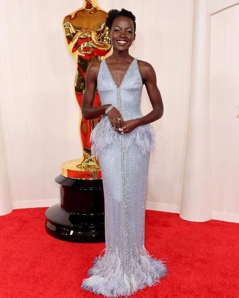 Satu lagi seleb yang mengenakan gaun sequin yaitu Lupita. Perempuan dengan segudang prestasi ini mengenakan dress buatan Armani Prive dengan detail bulu di pinggang ujung gaun.