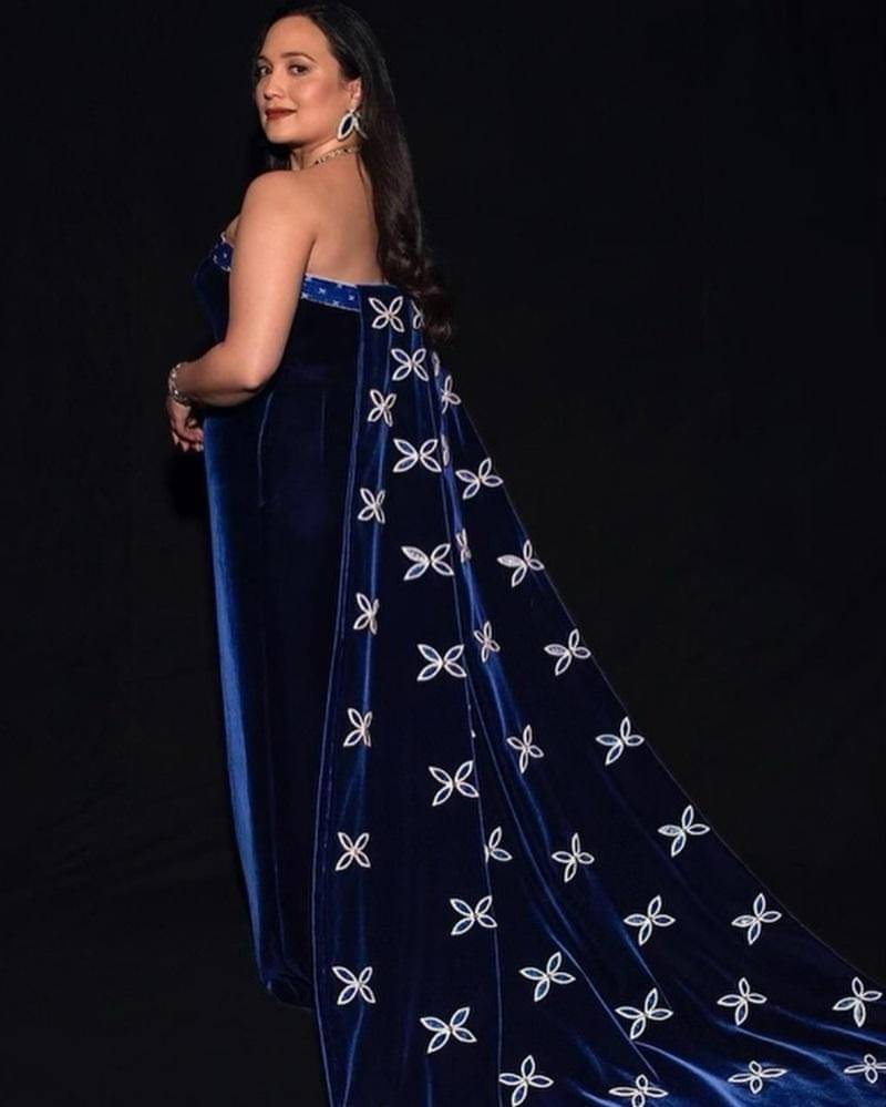 Mengenakan dress dari Gucci dan Joe Big Mountain, Lily Gladstone tampil memukau dengan gaun tanpa tali. Terbuat dari beludru, gaun ini memberi kesan mewah, apalagi dengan paduan warna biru nan elegan.