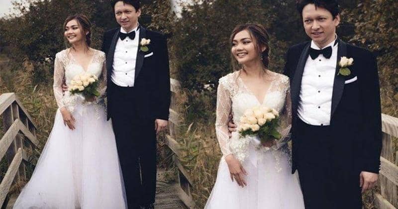 Rina menikah di Belanda dengan nuansa yang dreamy. Ia terlihat mengenakan dress putih dengan lace berpotongan v-neck.