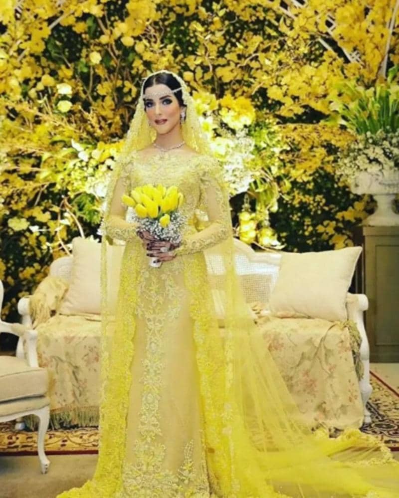 Beauty influencer Tasya Farasya memilih Ivan Gunawan untuk membuat salah satu gaun pernikahannya. Warna yang dipilih adalah kuning, gaun brokat panjang yang dipadukan dengan headpiece dan veil ini terlihat anggun di dirinya.