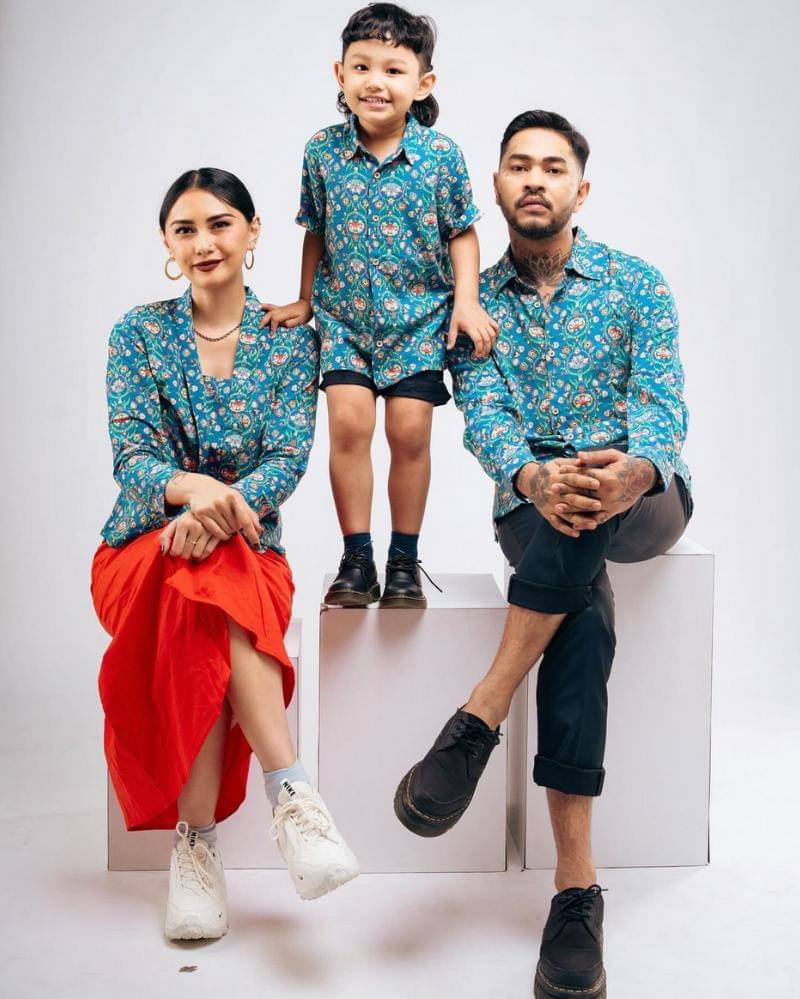Keluarga kecil ini menggunakan batik dengan motif dan warna yang sama. Onad dan Juan sama-sama mengenakan kemeja batik, perbedaannya hanya pada lengan, satu panjang dan satunya pendek.