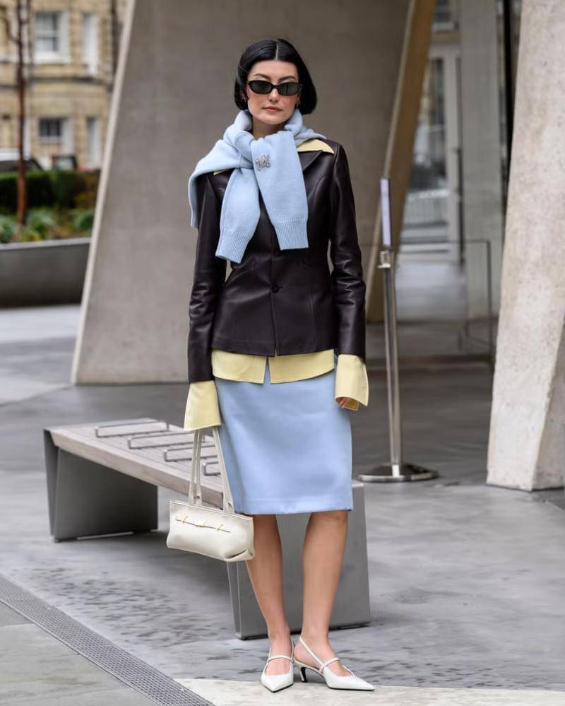 Bagi kamu yang menantikan musim semi, saatnya untuk mulai mengenakan pakaian berwarna pastel. Kombinasi warna biru muda dan kuning mentega, dipadukan dengan blazer kulit cokelat, adalah pilihan yang menarik.