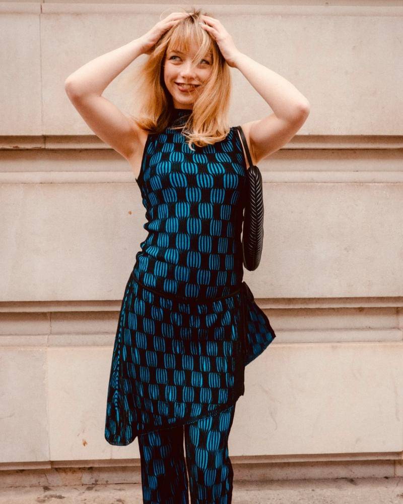 Paduan busana ini memberikan tampilan yang segar dan berbeda, yang pastinya dapat menarik perhatian siapapun. Apalagi ditambah kombinasi tas hitam dan sepatu berujung runcing berbahan kulit. Ini menciptakan busana dengan kesan yang ramai tapi juga minimalis, yang pas.