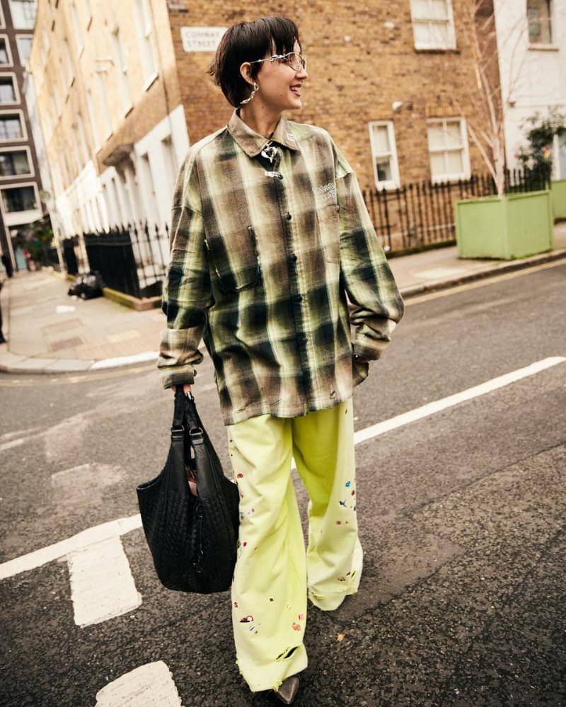 Kemeja kotak-kotak rasanya menjadi busana yang tak lekang oleh waktu, dan tahun ini Mama dapat melihat berbagai variasi paduannya yang semakin menarik. Seperti gaya yang satu ini, dimana kemeja kotak-kotak berwarna cokelat dengan corak hijau tersebut, dipadukan dengan celana longgar berwarna lime green.
