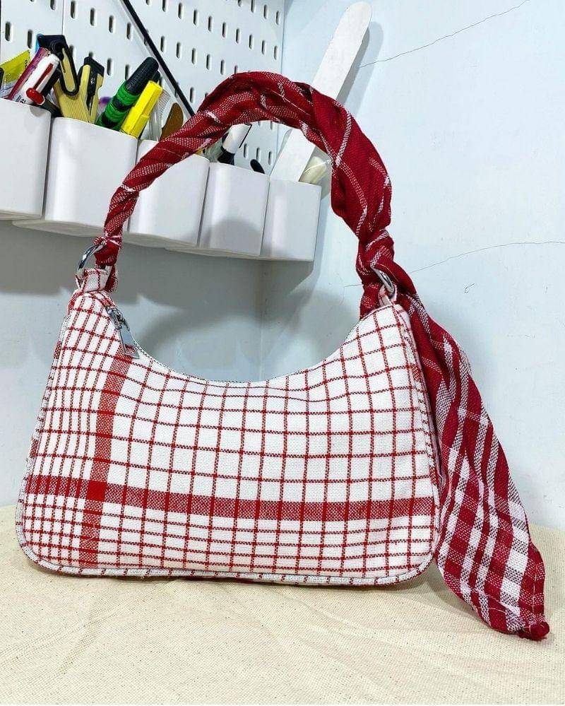 Masih dengan model hobo, tas berbahan kain lap itu dipasangkan dengan handle kain lap berwarna dasar merah yang diikatkan di kedua sisi tas.
