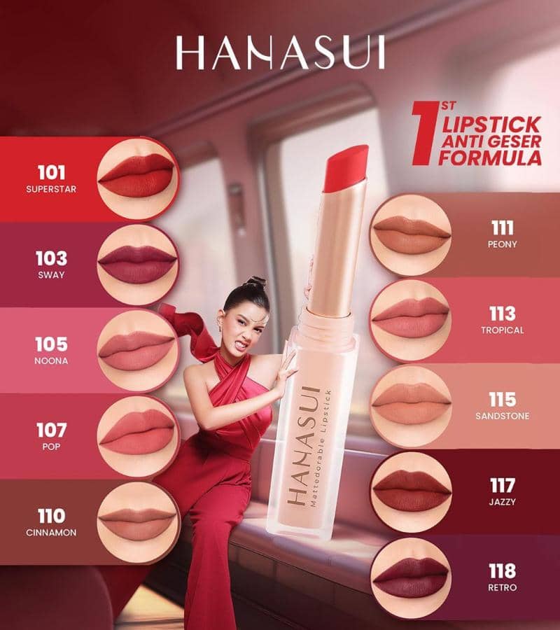 Hanasui Matteadorable Lipstick, hadir dalam berbagai pilihan warna yang beragam. Mulai dari nude yang natural hingga merah dramatis.