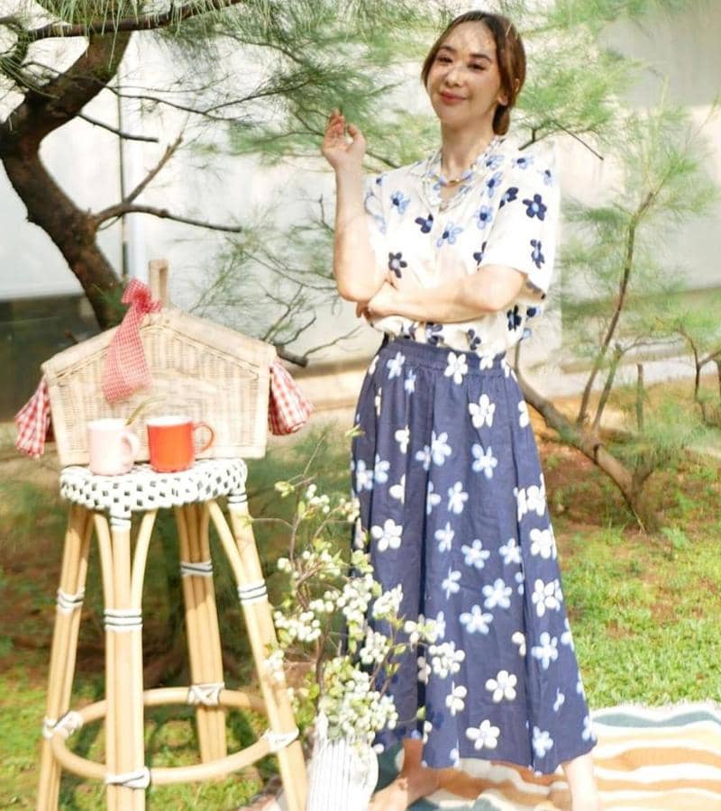 Andien memilih mengenakan t-shirt grafis tanpa lengan yang dipadukan dengan rok linen blend, dimana keduanya memiliki motif yang sama yaitu Ruuku untuk tampilan yang segar dan ceria.