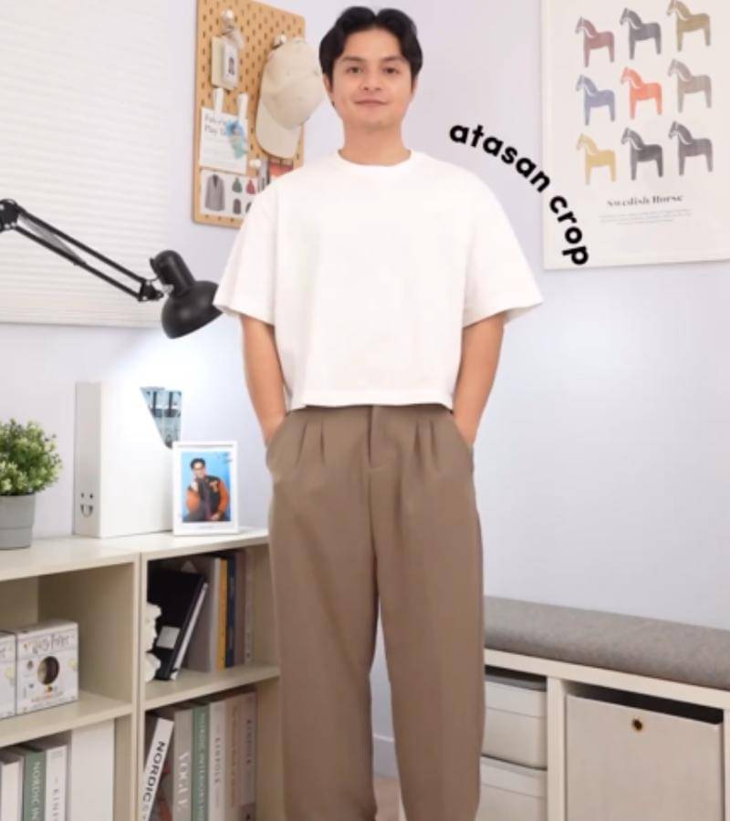 Pilihlah atasan kaos crop berwarna monokrom seperti putih, hitam, dan abu-abu, agar mudah dipadu padankan dengan bawahan celana pleated oversize bahan apa saja.