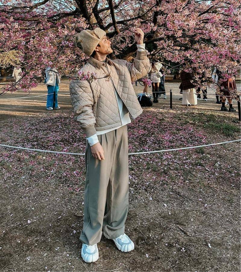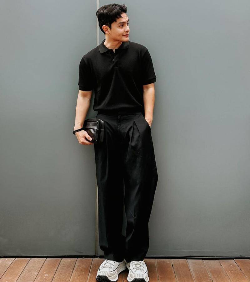 Pertimbangkan untuk memadukannya dengan atasan polo yang memiliki warna senada pula, misalnya pada potret di atas mengenakan polo shirt berwarna hitam yang menciptakan tampilan all black berkelas.