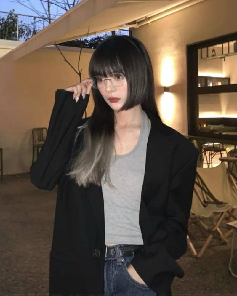 Transformasi rambutnya juga sama menawannya. Ia menyingkirkan poni yang lebih panjang dan berombak untuk poni mikro dan memilih gaya rambut lurus ramping yang mencapai bagian bawah gaun berkorsetnya. Sentuhan uniknya adalah lekukan ke atas pada lapisan atas rambutnya, membingkai wajahnya dengan cara yang menyerupai kontur riasan yang diaplikasikan secara ahli.