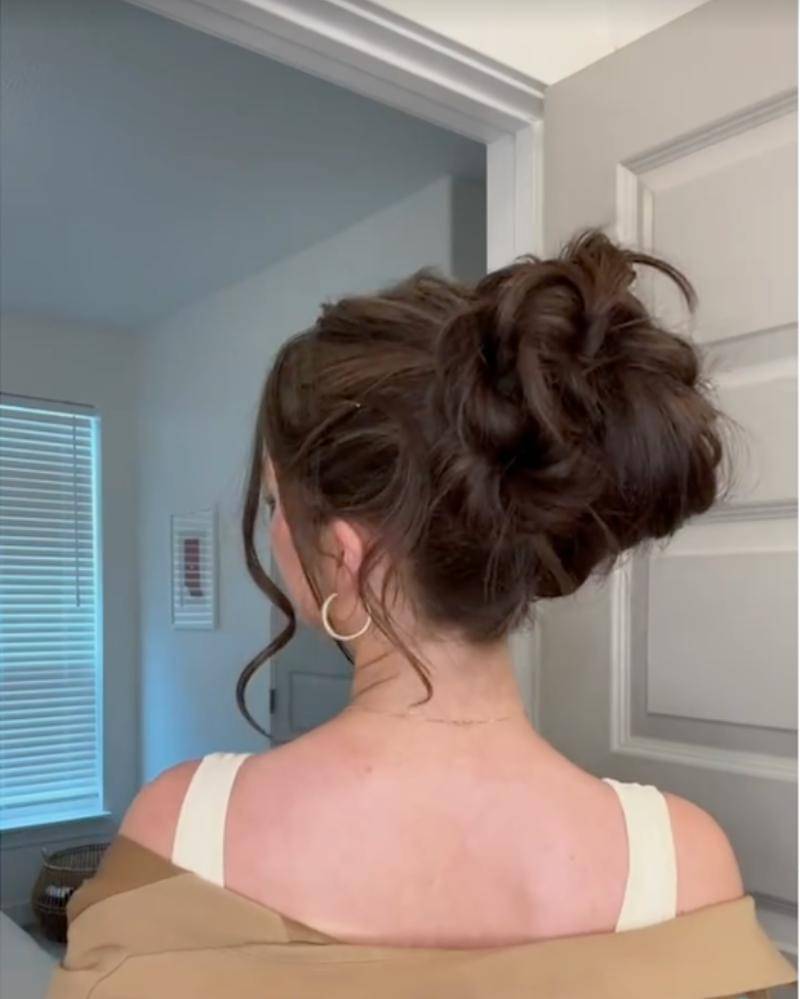 Untuk mendapatkan gaya ini, penata rambut Bellemare menyarankan untuk membuat rambut bergelombang atau ikal yang longgar. Kemudian, aplikasikan semprotan penambah tekstur dan jepit rambut dengan longgar menjadi gaya rambut updo, pastikan helaian rambut yang lembut membingkai wajah.