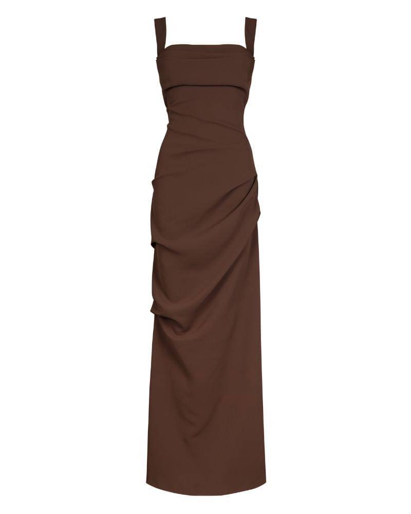 Siapa bilang gaun pesta tidak bisa kelihatan mewah dalam warna cokelat? Gaun maxi berpotongan leher persegi satu ini, mudah dikenakan dan sangat cocok untuk acara malam yang berkelas.