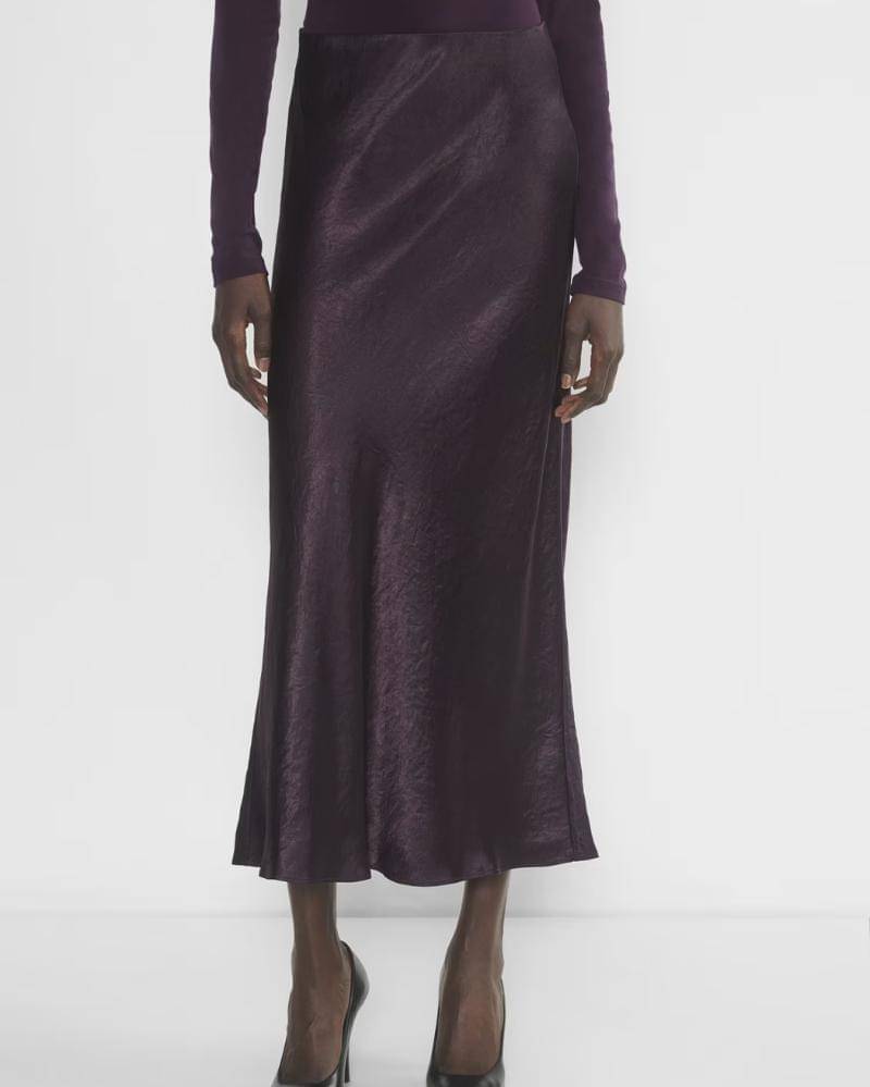 Rok slip berpotongan miring dengan warna cokelat yang mewah adalah pilihan yang sempurna untuk pesta liburan, hari kerja, atau acara apa pun yang menuntut keanggunan yang berkelas. Baik dengan ikat pinggang atau tidak, rok ini memancarkan estetika yang anggun dan berkelas.