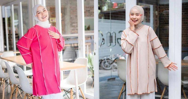 Seperti tampilan tunik pastel yang satu ini, tunik tersebut memberikan efek ramping dengan aksen garis-garis. Mama bisa membelinya di Azzahra Official 21 di Shopee.