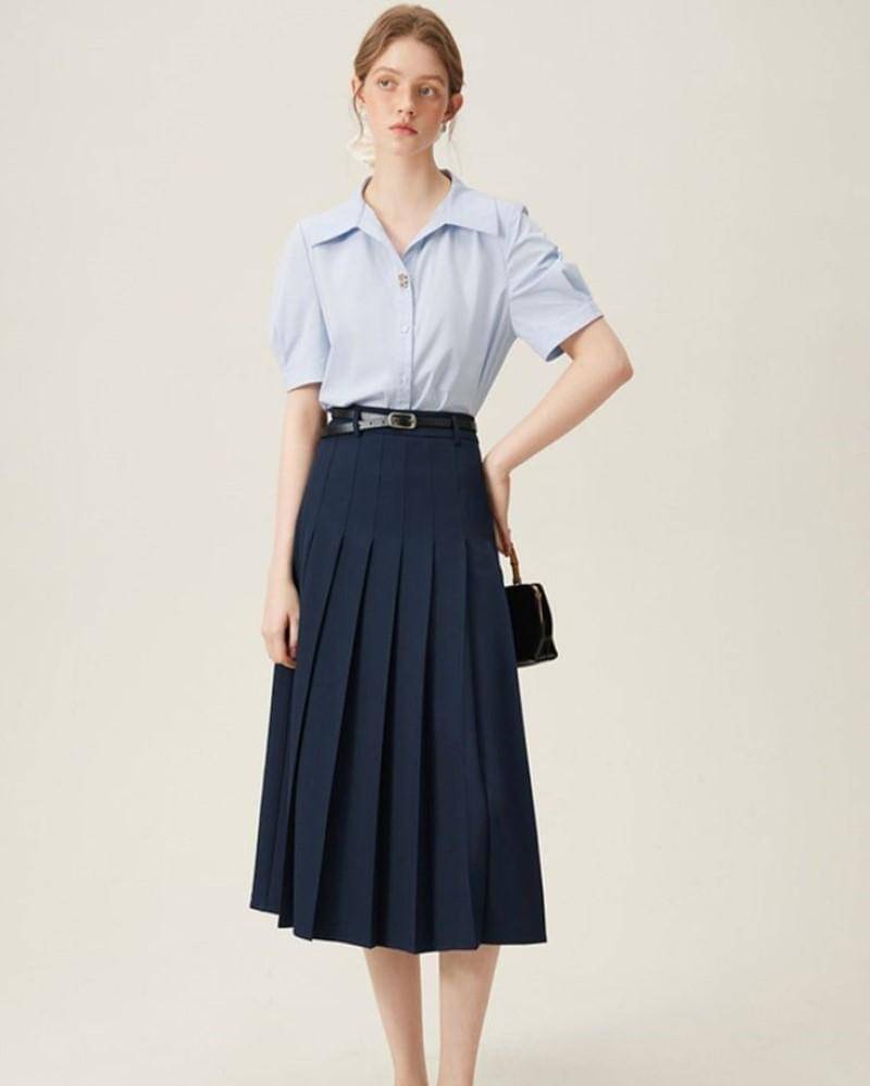 Gunakan rok lipit dan kemeja seperti ini untuk kesan yang klasik dan menarik.