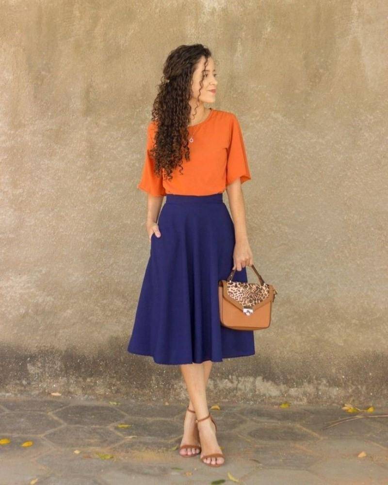 Warna biru dongker bisa dipadukan dengan warna oranye terang.Dengan pilihan outfit yang tepat, penampilan Mama malah terlihat berani dan unik.