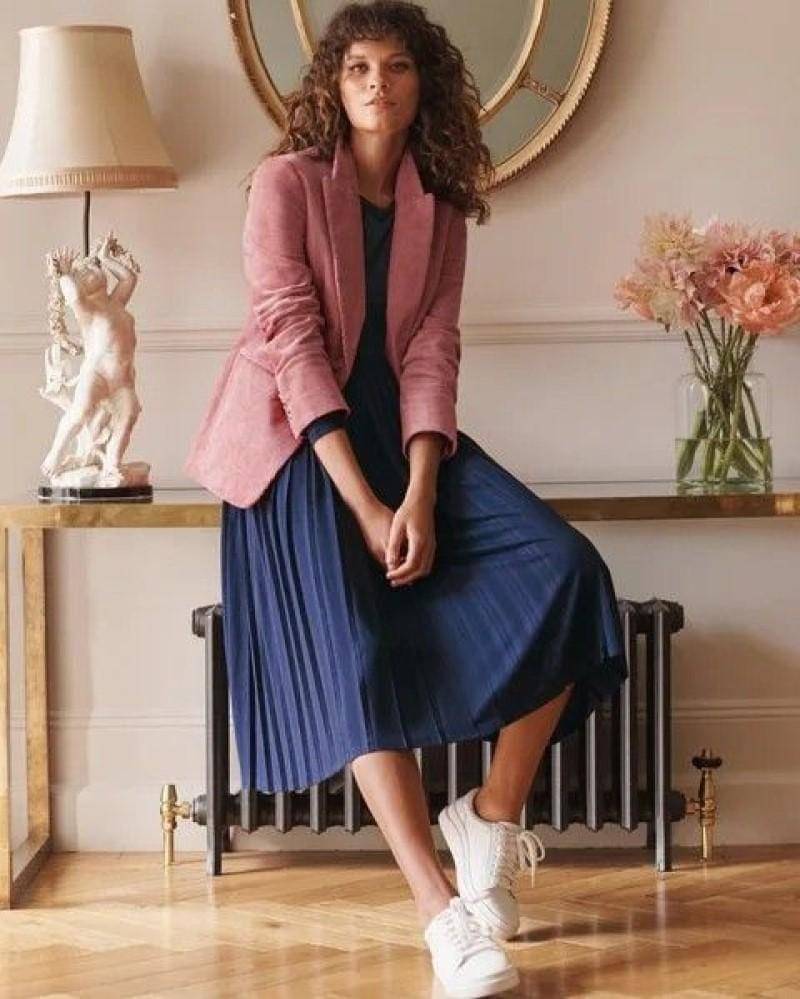 Apa jadinya kalau warna biru dongker dipadukan dengan atasan dusty pink? Tentu saja jadi penampilan yang misterius sekaligus feminin.
