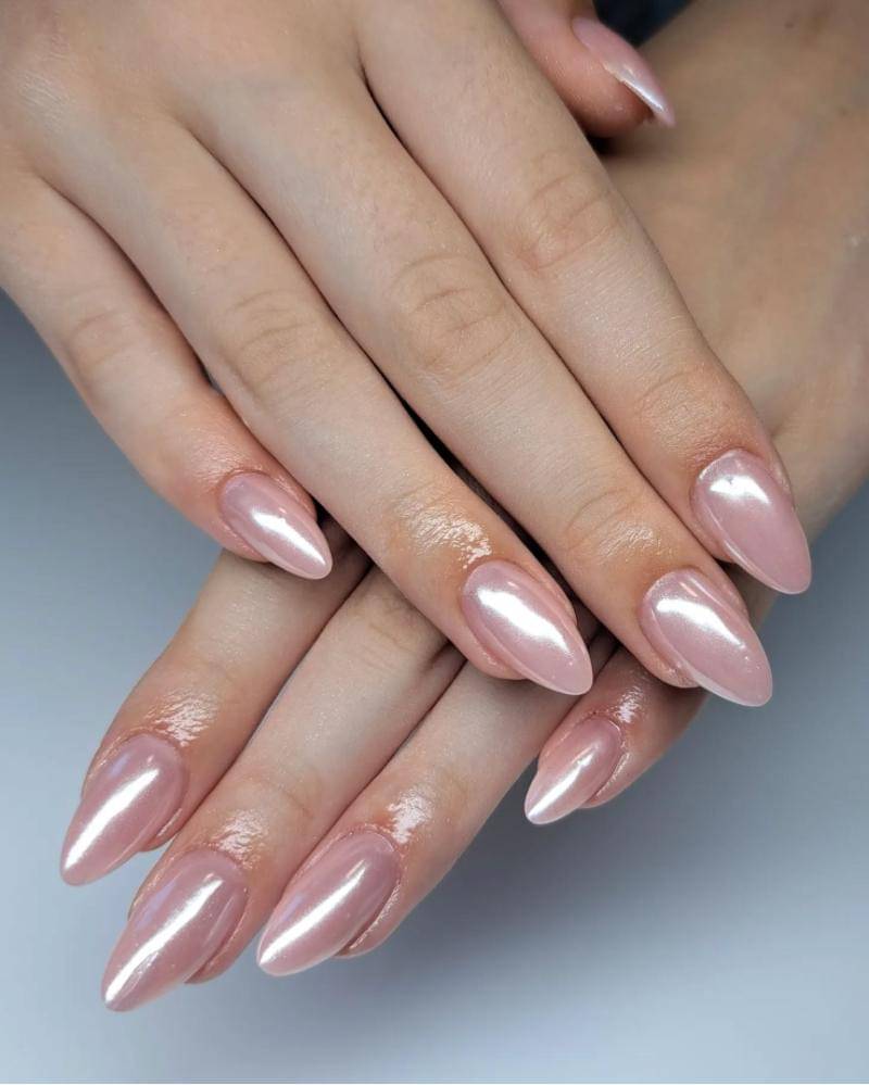 Dapatkan tampilan kuku yang mengilap dan trendi dengan melapisi cat kuku warna nude atau merah muda lembut dengan bubuk krom. Teknik ini menciptakan kilau mutiara yang dicari, seperti tren "donat mengilap".