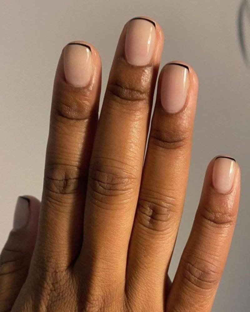 Daripada garis putih tebal yang menjadi khas french manicure, Mama coba gaya yang satu ini, deh. Gayanya masih terinspirasi dari french manicure, hanya saja gaya ini memiliki garis yang sangat sempit di tepi kuku, yang memberikan hasil akhir yang halus namun mengilap.