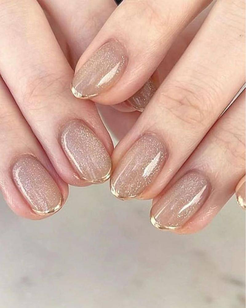 Gaya yang diperbarui ini mengganti ujung kuku yang putih bersih dengan warna krem yang lembut, menyatu mulus dengan dasar kuku yang tipis dan hampir transparan. Hasilnya adalah manikur yang bersahaja dan elegan, ideal bagi mereka yang menginginkan penampilan yang halus namun elegan.