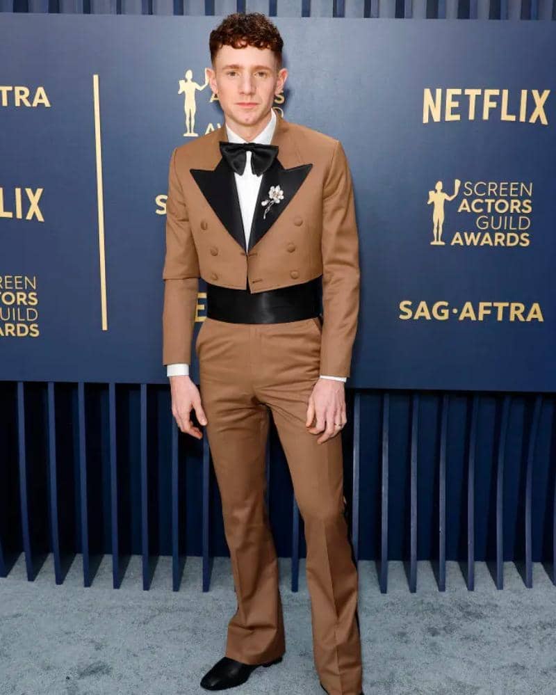 Aktor Abbott Elementary, Chris Perfetti, terlihat memakai setelan jas berwarna cokelat yang dipasangkan dengan celana bootcut. Sayangnya gaya tersebut terasa membawa kembali kesan pilihan fesyen sekolah menengah tahun 1980-an.