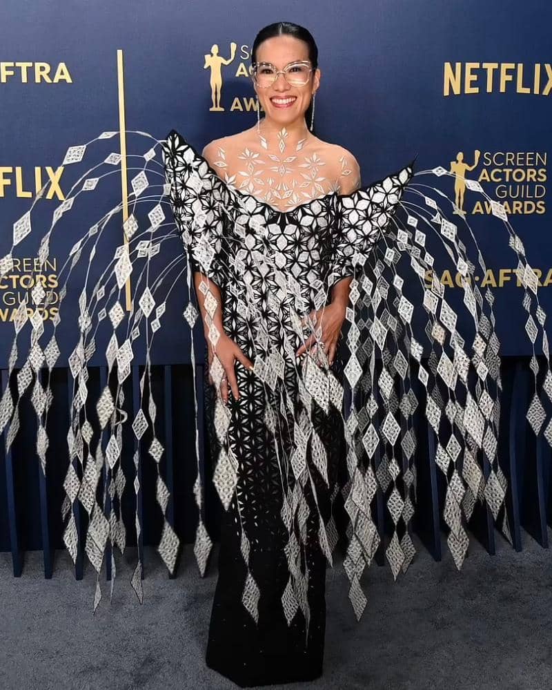 Ali Wong membuat penampilan yang agak membingungkan di karpet merah dalam balutan gaun besar. Pasalnya ia mengenakan untaian hiasan berbentuk berlian yang beterbangan di sisinya, membuat komedian itu tampak seperti seekor merpati.