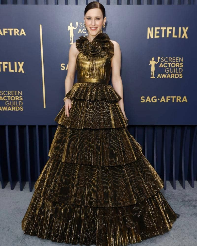 Gaun emas metalik Rachel Brosnahan juga memicu perbandingan dengan objek yang kurang bagus. Bentuk gaunnya yang seperti lonceng dan rok lipit berlapis menciptakan siluet yang tidak biasa dan bayangan yang mengganggu di bawah kilatan kamera.
