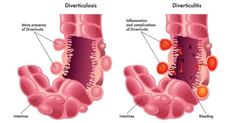 Orang dengan divertikulitis mungkin mengalami nyeri hebat di sisi kiri perut, disertai masalah pencernaan seperti sembelit atau diare, demam, dan merasa mual. Divertikula umum terjadi dan bahkan lebih sering terjadi setelah usia 65 tahun.