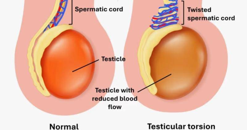 Torsi testis terjadi ketika testis terpelintir atau berputar pada korda spermatika, yang memasok darah ke skrotum. Hal ini dapat menyebabkan nyeri hebat dan pembengkakan pada skrotum, serta gejala lain seperti mual, muntah, demam, dan sering buang air kecil.