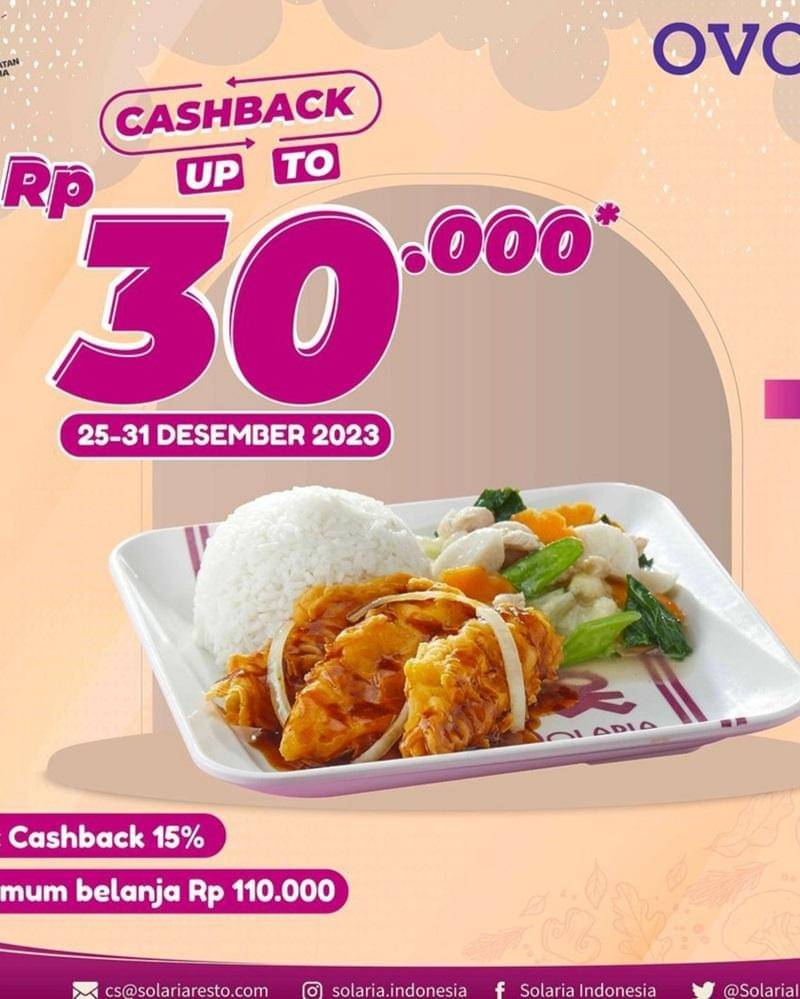 Ada promo akhir tahun dari Solaria yaitu cashback sebesar 15% untuk pembayaran dengan OVO. Besaran cashback maksimal adalah Rp 30 ribu dengan pembelian minimal Rp 110 ribu.