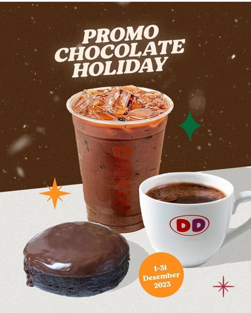 Di Dunkin Donuts, ada promo Chocolate Holiday. Untuk pembelian 6 donut classics dan 1 hot/iced chocolate (dengan/tanpa susu) adalah Rp 70 ribu. Sedangkan untuk 12 donut classics dan 2 hot/iced chocolate (dengan/tanpa susu) adalah Rp 120 ribu.